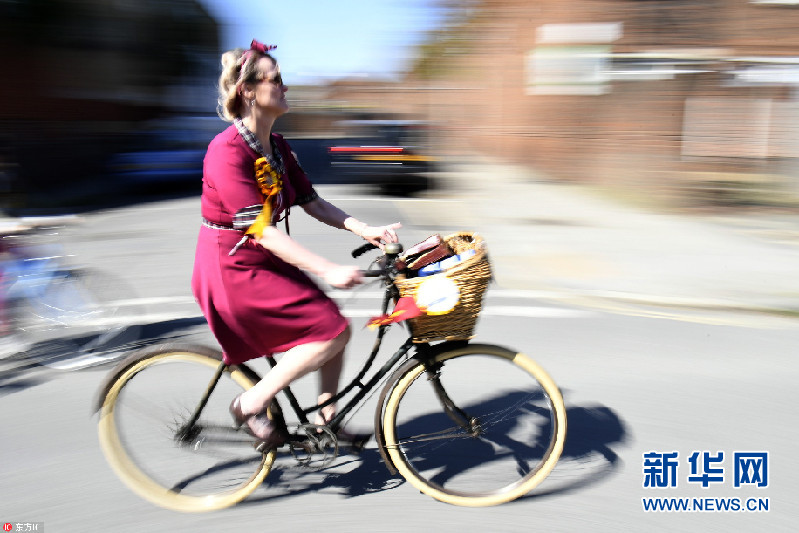 當?shù)貢r間2018年5月5日,英國倫敦,當?shù)嘏e辦復古騎行活動,民眾身穿花呢子服裝騎車穿行在倫敦街頭。今年是該活動舉辦十周年。(圖片來源:東方IC)