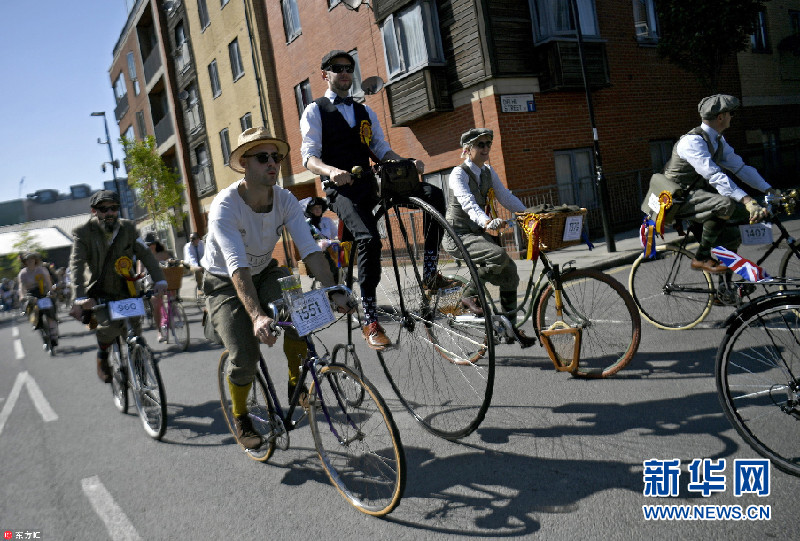 當(dāng)?shù)貢r(shí)間2018年5月5日,英國倫敦,當(dāng)?shù)嘏e辦復(fù)古騎行活動(dòng),民眾身穿花呢子服裝騎車穿行在倫敦街頭。今年是該活動(dòng)舉辦十周年。(圖片來源:東方IC)