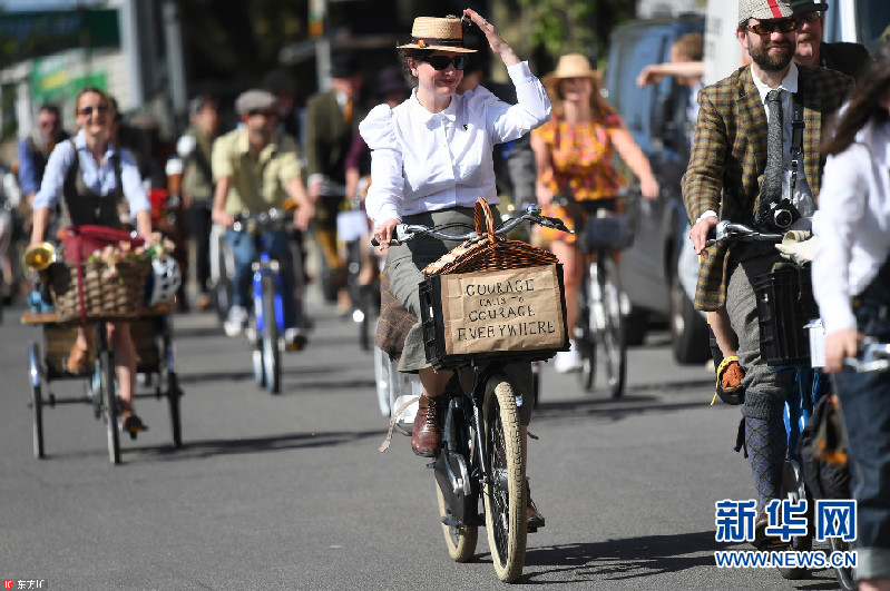 當(dāng)?shù)貢r(shí)間2018年5月5日,英國(guó)倫敦,當(dāng)?shù)嘏e辦復(fù)古騎行活動(dòng),民眾身穿花呢子服裝騎車穿行在倫敦街頭。今年是該活動(dòng)舉辦十周年。(圖片來(lái)源:東方IC)
