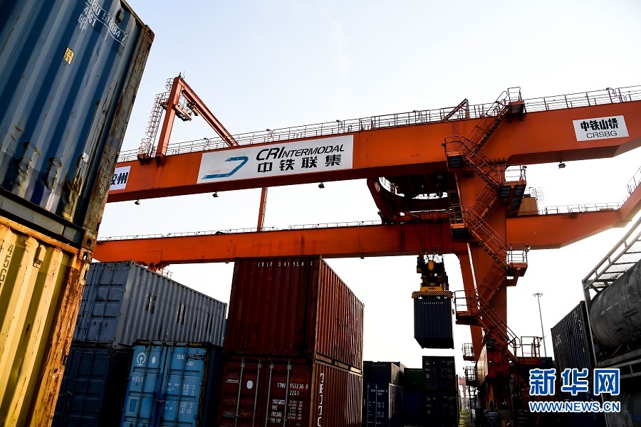 占地1800畝的中鐵聯(lián)集青島中心站內(nèi),藍(lán)色、白色的集裝箱把場站裝點(diǎn)成一片“集裝箱海洋”;橫穿場站的兩條鐵軌旁,數(shù)座巨型龍門吊繁忙作業(yè),來自海上的貨物被搬運(yùn)至將遠(yuǎn)行的國際班列上……