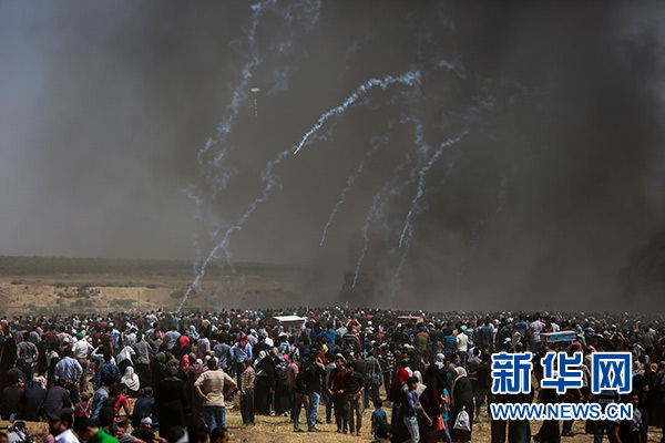 5月14日,在加沙城以東的加沙地帶與以色列交界地區(qū),巴勒斯坦示威者與以色列軍隊發(fā)生沖突。新華社發(fā)