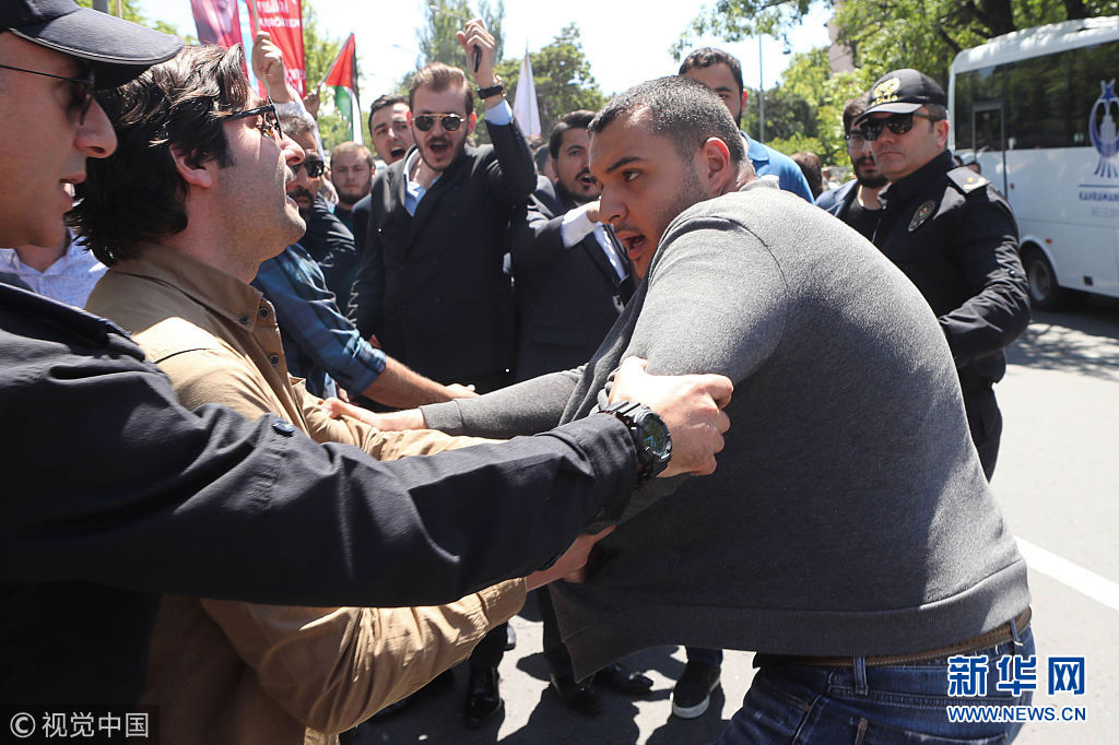 5月15日,土耳其安卡拉,示威者在以色列領(lǐng)事館附近投擲雞蛋和石塊,抗議美國(guó)駐以色列使館遷至耶路撒冷。(圖片來源:視覺中國(guó))