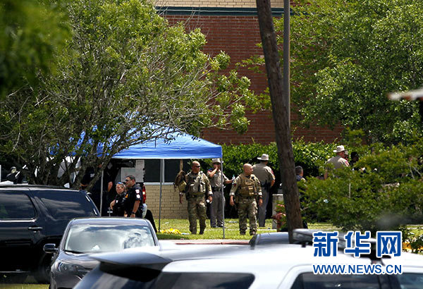 5月18日,在美國(guó)得克薩斯州加爾維斯頓郡圣菲市,安全人員在發(fā)生槍擊的圣菲高中周圍警戒。新華社發(fā)(宋穹 攝)