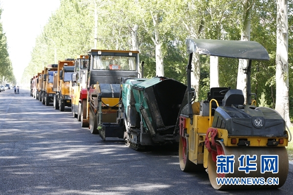比什凱克和平大街上剛剛鋪好的瀝青路面和施工車(chē)。新華網(wǎng)發(fā)