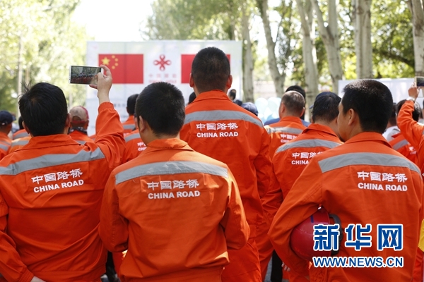 開(kāi)工儀式上的中國(guó)路橋工人。新華網(wǎng)發(fā)