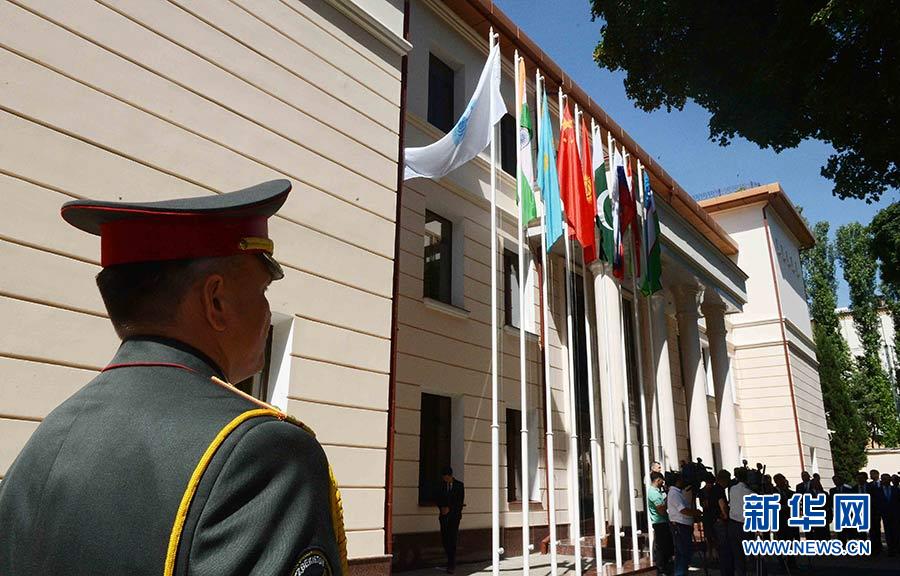 2017年6月15日,上海合作組織地區(qū)反恐怖機構(gòu)執(zhí)委會在烏茲別克斯坦首都塔什干舉行印度和巴基斯坦國旗升旗儀式,迎接兩個新成員的加入。新華社記者 沙達提 攝