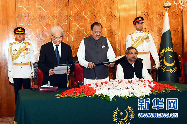 6月1日,在巴基斯坦伊斯蘭堡,納賽爾·穆?tīng)柨耍ㄇ白螅┬木腿伟瓦^(guò)渡政府總理。新華社發(fā)
