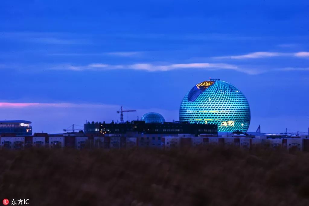 哈薩克斯坦阿斯塔納世博會主場館夢幻夜景,當(dāng)今世界最大玻璃球形建筑。