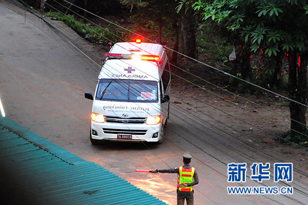 這是7月8日在泰國清萊拍攝的運送被解救出的少年足球隊員的救護車。新華社發(fā)(拉亨 攝)
