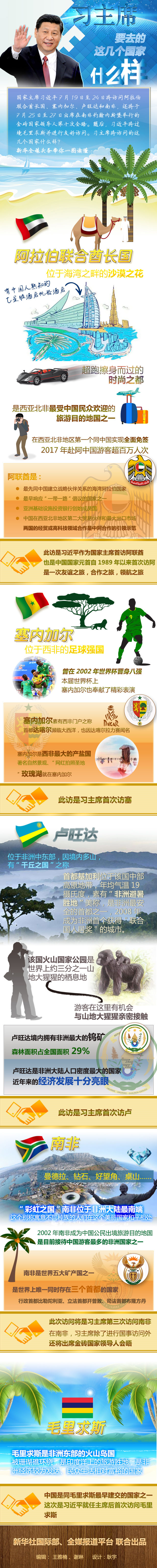 季夏之月,赴萬里之約。7月19日至28日,習(xí)近平主席將對(duì)阿聯(lián)酋、塞內(nèi)加爾、盧旺達(dá)和南非進(jìn)行國事訪問,出席在南非約翰內(nèi)斯堡舉行的金磚國家領(lǐng)導(dǎo)人第十次會(huì)晤,過境毛里求斯并進(jìn)行友好訪問。