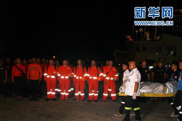 7月15日,在泰國普吉深海碼頭,交通運輸部廣州打撈局救援隊、泰國海軍、志愿潛水員等參加遺體迎接儀式。新華社記者楊舟攝