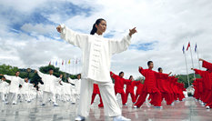 甘肅平?jīng)觯汗沛?zhèn)上演萬人太極拳表演