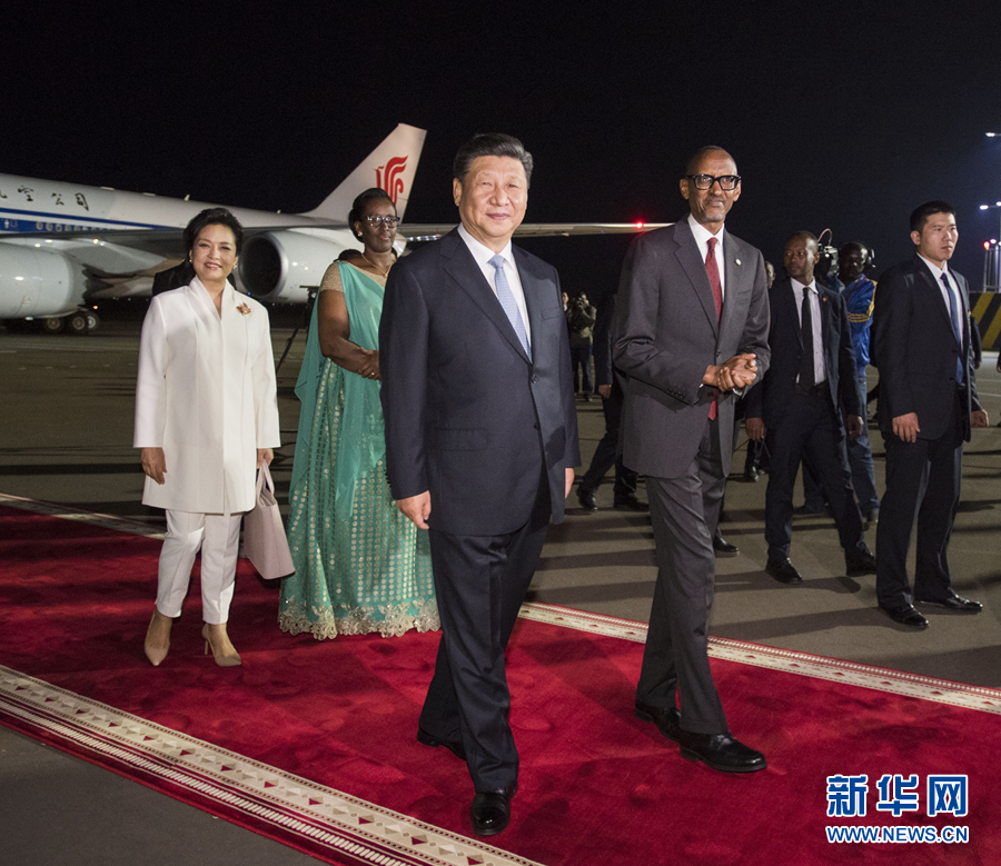 當(dāng)?shù)貢r(shí)間晚8時(shí)50分許,習(xí)近平乘坐的專(zhuān)機(jī)抵達(dá)基加利國(guó)際機(jī)場(chǎng)。習(xí)近平和夫人彭麗媛步出艙門(mén),受到盧旺達(dá)總統(tǒng)卡加梅和夫人珍妮特等熱情迎接。盛裝的禮兵精神抖擻,向尊貴的客人行注目禮。盧旺達(dá)少年向習(xí)近平和彭麗媛獻(xiàn)花??用废蛄?xí)近平和彭麗媛介紹盧方其他迎接人員。身著靚麗民族服裝的當(dāng)?shù)孛癖娞饸g快的迎賓舞,敲響喜慶的非洲鼓,熱烈歡迎中國(guó)貴賓到來(lái)。