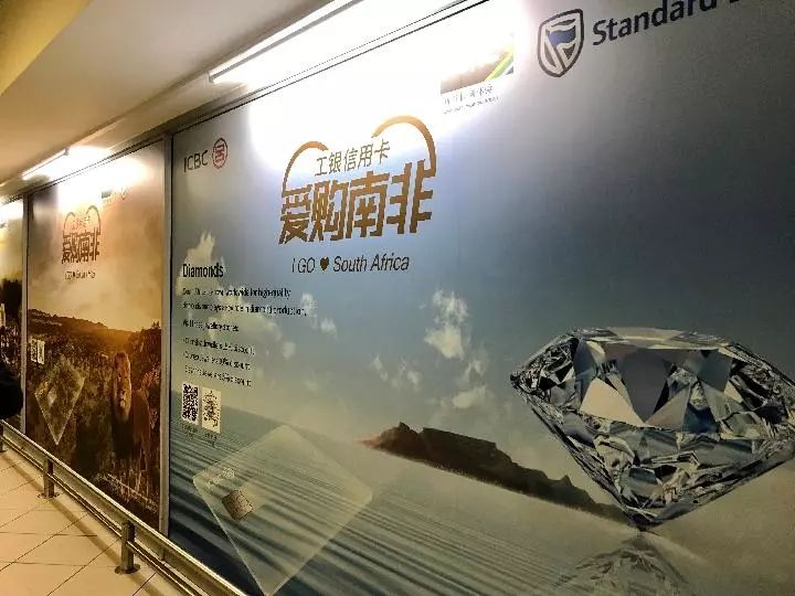 約翰內(nèi)斯堡奧利弗·坦博國(guó)際機(jī)場(chǎng)內(nèi),中國(guó)工商銀行和南非標(biāo)準(zhǔn)銀行聯(lián)合推出的中英雙語(yǔ)廣告非常醒目。