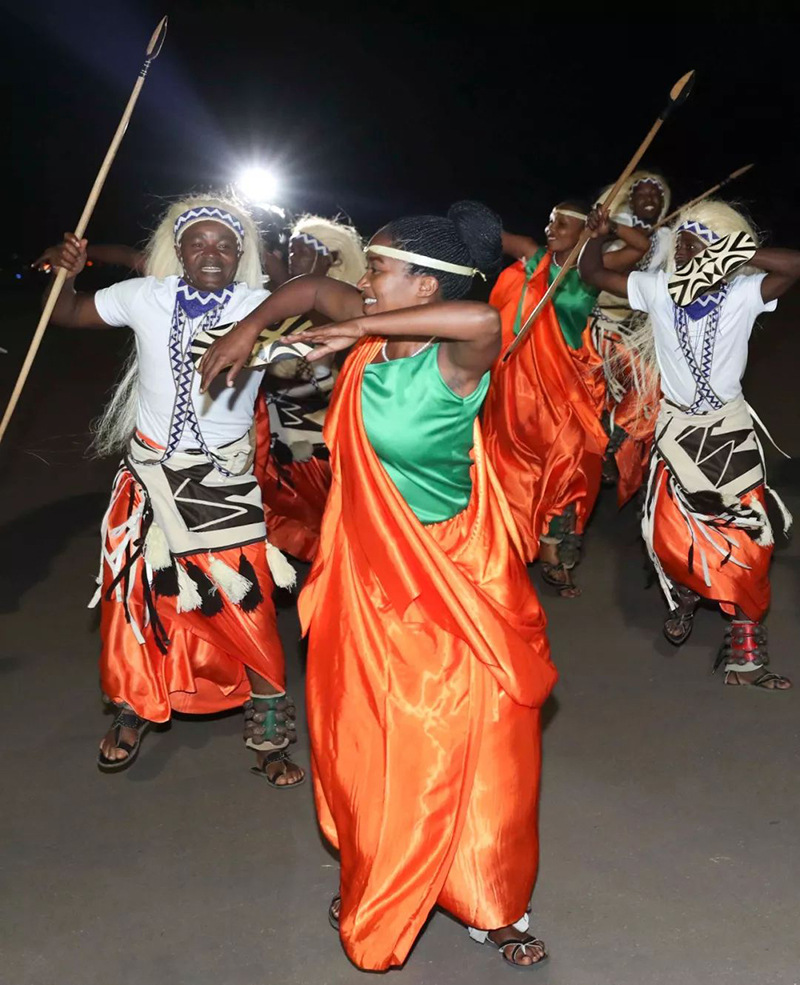夜空之下,基加利國際機(jī)場。山光點(diǎn)點(diǎn),笑臉盈盈,樂鼓咚咚??用房偨y(tǒng)夫婦在這里為習(xí)近平主席和夫人彭麗媛舉行隆重的歡迎儀式。