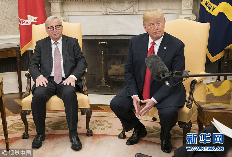 2018年7月25日,美國(guó)華盛頓,美國(guó)總統(tǒng)特朗普與歐盟委員會(huì)主席容克會(huì)面。(圖片來源:視覺中國(guó))