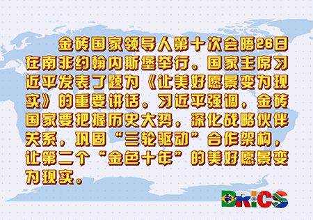金磚國家領(lǐng)導(dǎo)人第十次會晤26日在南非約翰內(nèi)斯堡舉行。國家主席習(xí)近平發(fā)表了題為《讓美好愿景變?yōu)楝F(xiàn)實(shí)》的重要講話。習(xí)近平強(qiáng)調(diào),金磚國家要把握歷史大勢,深化戰(zhàn)略伙伴關(guān)系,鞏固“三輪驅(qū)動(dòng)”合作架構(gòu),讓第二個(gè)“金色十年”的美好愿景變?yōu)楝F(xiàn)實(shí)。?