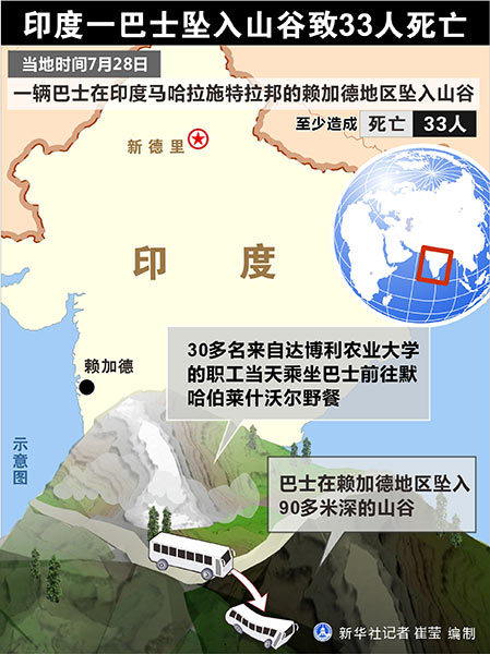 新華社新德里7月28日電(記者 姜磊)一輛巴士28日在印度馬哈拉施特拉邦的賴加德地區(qū)墜入山谷,警方說車禍造成至少33人死亡。
