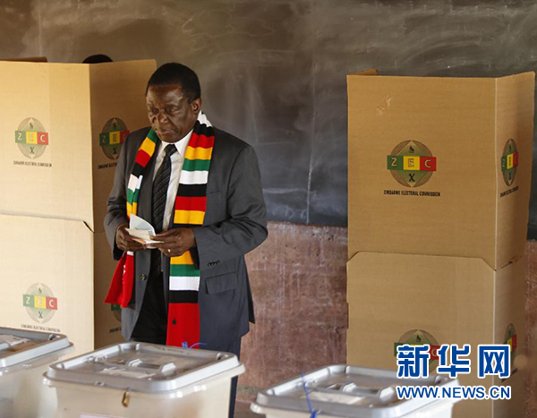 7月30日,在津巴布韋奎奎市,總統(tǒng)姆南加古瓦在一處投票站參加投票。 新華社發(fā)(肖恩·朱薩攝)