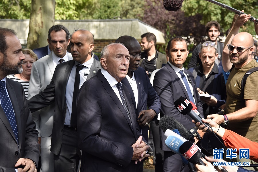 8月23日,在法國(guó)巴黎西南郊特拉普市,法國(guó)內(nèi)政部長(zhǎng)科隆(中)向媒體介紹情況。 新華社記者陳益宸攝