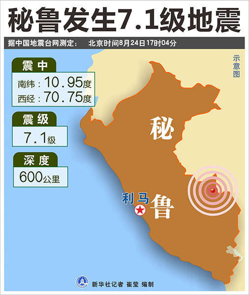 新華社利馬8月24日電? 秘魯東部與巴西交界地區(qū)24日發(fā)生7.1級地震,目前尚無人員傷亡和財產(chǎn)損失報告。
