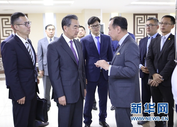 8月25日,在蒙古國首都烏蘭巴托,中國國務(wù)委員兼外交部長(zhǎng)王毅(前中)在蒙古國外長(zhǎng)朝格特巴特爾(前右)的陪同下專程來到烏蘭巴托成吉思汗國際機(jī)場(chǎng)考察“一帶一路”快速通道并現(xiàn)場(chǎng)了解情況。 新華社記者阿斯鋼攝