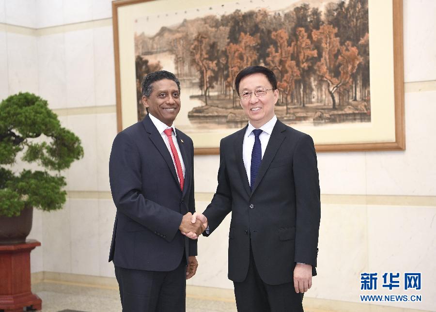 9月1日,國(guó)務(wù)院副總理韓正在北京釣魚(yú)臺(tái)國(guó)賓館會(huì)見(jiàn)塞舌爾總統(tǒng)富爾。 新華社記者 燕雁 攝