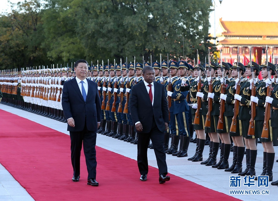 10月9日,國家主席習(xí)近平在北京人民大會堂同安哥拉總統(tǒng)洛倫索舉行會談。這是會談前,習(xí)近平在人民大會堂東門外廣場為洛倫索舉行歡迎儀式。 新華社記者姚大偉攝