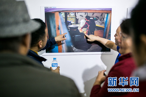10月14日,在蒙古國首都烏蘭巴托,人們觀看“今日蒙古國”國際攝影采風(fēng)活動作品展。新華社記者 白雪騏 攝