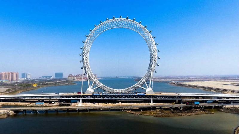 “渤海之眼”摩天輪由一個外層外形支承桁架組成。這個環(huán)形架由4600噸鋼梁建成,花兩年時間建造。有別于傳統(tǒng)的有軸摩天輪,渤海之眼摩天輪中間沒有任何支撐,運行時輪盤不轉(zhuǎn)動,轎廂自帶行走機構(gòu),通過軌道沿輪盤轉(zhuǎn)動。