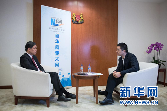 近日,新加坡貿(mào)工部長(zhǎng)陳振聲在新加坡接受新華網(wǎng)專訪。圖為陳振聲(左)與本次訪談主持人、新華網(wǎng)新加坡負(fù)責(zé)人吳磊對(duì)話。新華網(wǎng) 王應(yīng)耀 攝