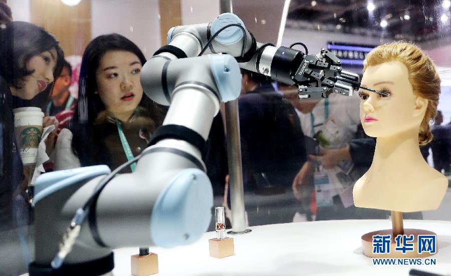 11月7日,參觀者在法國歐萊雅展臺觀看機(jī)器人作業(yè)演示。 休戚與共的地球村,共享創(chuàng)新成果已成為國際社會的共同意愿和現(xiàn)實(shí)選擇。透過進(jìn)博會這個(gè)窗口可以看出,從上下游產(chǎn)業(yè)銜接到前沿領(lǐng)域合作,從協(xié)作共享資源到開放共享智慧,全球經(jīng)濟(jì)發(fā)展的新動能正在匯聚。 新華社記者 方喆 攝