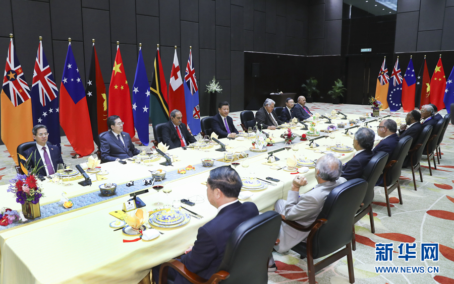 11月16日,國家主席習近平在莫爾茲比港同巴布亞新幾內亞總理奧尼爾、密克羅尼西亞聯(lián)邦總統(tǒng)克里斯琴、薩摩亞總理圖伊拉埃帕、瓦努阿圖總理薩爾瓦伊、庫克群島總理普納、湯加首相波希瓦、紐??偫硭冉ń惶窖髰u國領導人以及斐濟政府代表、國防部長昆布安博拉舉行集體會晤。習近平主持會晤并發(fā)表主旨講話。 新華社記者 謝環(huán)馳 攝