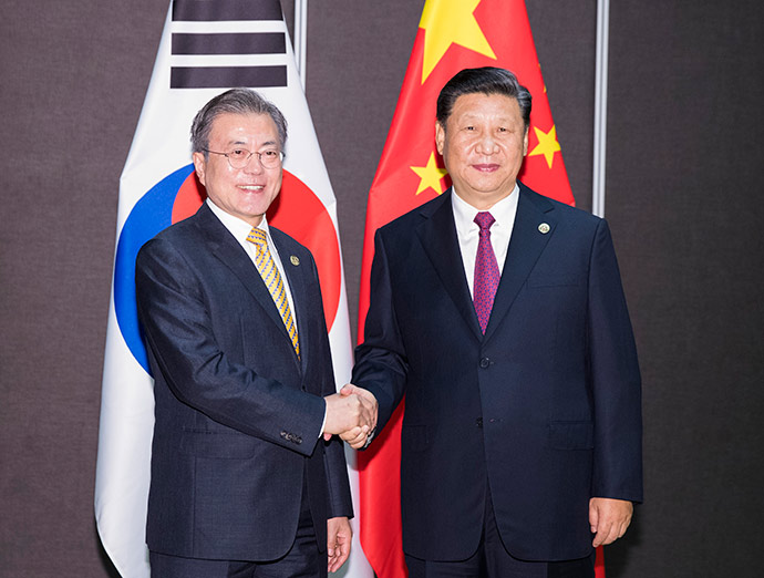 11月17日,國家主席習近平在莫爾茲比港會見韓國總統(tǒng)文在寅。新華社記者 黃敬文 攝