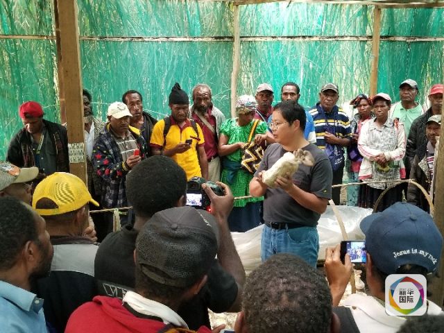 2018年9月4日,在巴布亞新幾內(nèi)亞東高地省戈羅卡市中國福建省援巴新菌草與旱稻技術合作項目基地,項目組組長林應興向當?shù)孛癖娭v解菌草種植技術。(新華社記者莫華英攝)