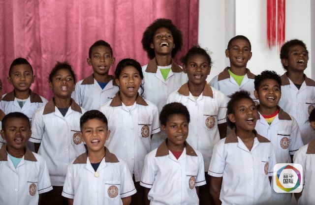 2018年11月13日,巴布亞新幾內(nèi)亞首都莫爾茲比港。孩子們?yōu)闅g迎出席中國-巴新友誼學?!げ紙D卡學園啟用儀式的習近平主席精心排練歌曲《茉莉花》。(新華社記者費茂華攝)
