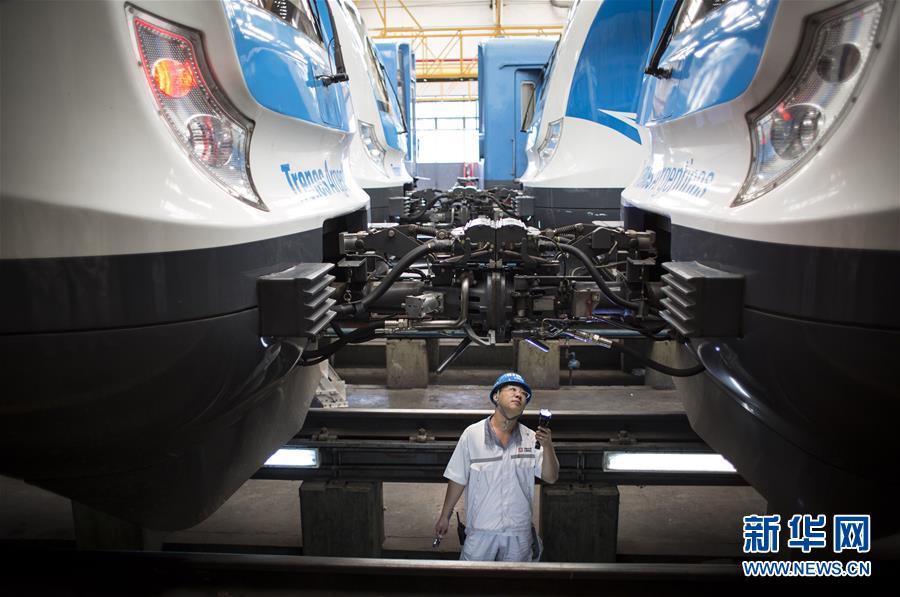 2017年4月11日,在位于阿根廷首都布宜諾斯艾利斯以南的利亞瓦略爾,中方技術(shù)人員檢查為羅卡線城際鐵路提供的列車。近年來(lái),在阿根廷,中車制造的各種軌距、各種制式、各種型號(hào)的鐵路機(jī)車、動(dòng)車組、客車、貨車和地鐵列車密集交付。新華社發(fā)(馬丁·薩巴拉 攝)