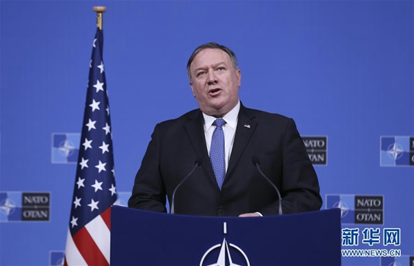 12月4日,在比利時(shí)布魯塞爾,美國(guó)國(guó)務(wù)卿蓬佩奧出席新聞發(fā)布會(huì)。 新華社記者 葉平凡 攝