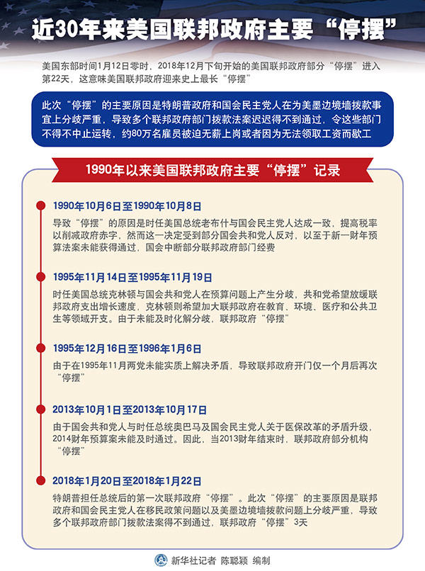 新華社華盛頓1月12日電 新聞背景:近30年來美國(guó)聯(lián)邦政府主要“停擺”