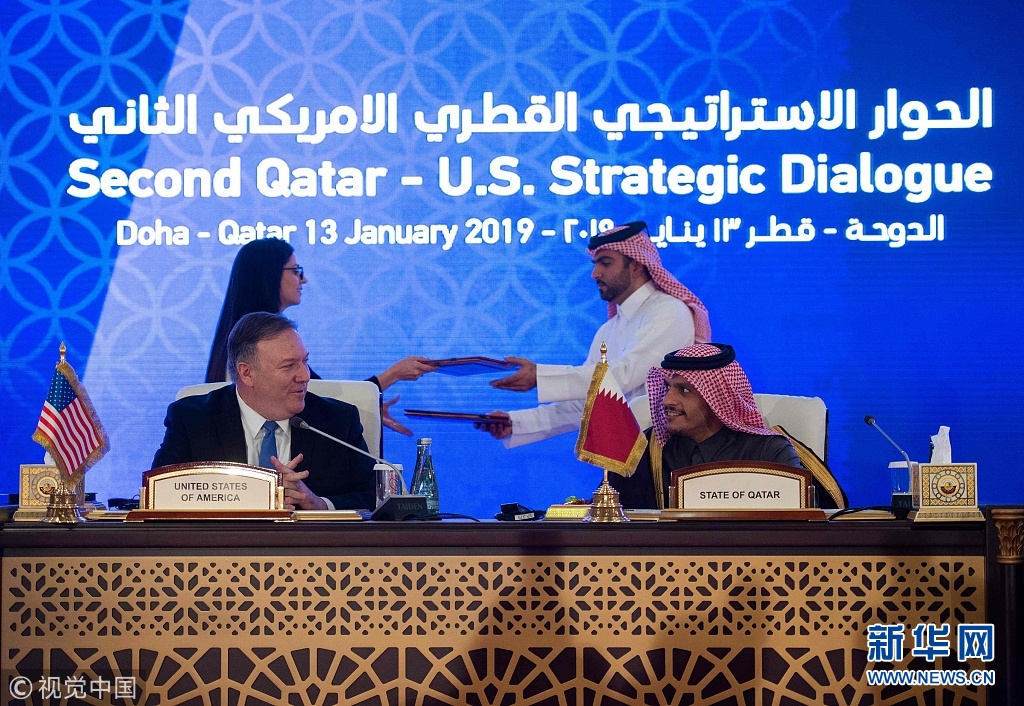 2019年1月13日,卡塔爾多哈,美國國務(wù)卿邁克·蓬佩奧訪問卡塔爾。蓬佩奧與卡塔爾副首相兼外交大臣穆罕默德在多哈的喜來登大酒店簽署了諒解備忘錄和意向聲明并舉行聯(lián)合記者會。蓬佩奧表示,兩國外交部門領(lǐng)導(dǎo)人當(dāng)天簽署了一份諒解備忘錄,將擴建和改造烏代德美國空軍基地。(圖片來源:視覺中國)