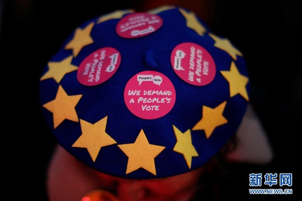 1月15日,在英國(guó)倫敦,一名戴著帽子的反對(duì)英國(guó)“脫歐”示威者在議會(huì)大廈外參加集會(huì)。 新華社發(fā)(蒂姆·愛爾蘭攝)
