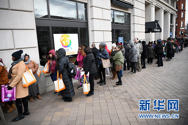 政府“停擺”依舊,冬寒并未遠(yuǎn)走,華盛頓哥倫比亞特區(qū)的道路上行人稀少、商戶門廳冷清,但在國家廣場附近一處街角卻見人排起了長隊。