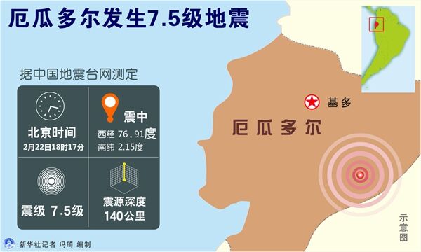 新華社基多2月22日電(記者郝云甫)厄瓜多爾中南部地區(qū)22日發(fā)生7.5級地震,首都基多、第一大城市瓜亞基爾及多個省份均有震感。目前尚無人員傷亡和財產(chǎn)損失報告。