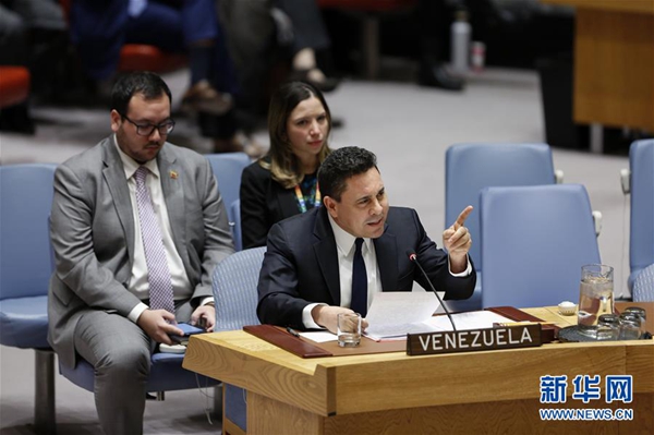 2月28日,在位于紐約的聯(lián)合國總部,委內(nèi)瑞拉常駐聯(lián)合國代表薩穆埃爾·蒙卡達(dá)(前)在安理會會議上發(fā)言。 新華社記者 李木子 攝