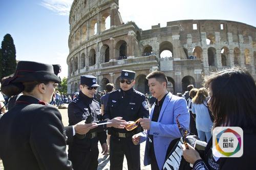 2016年5月2日,中方警員與意大利同行在羅馬斗獸場(chǎng)外執(zhí)行聯(lián)合巡邏。新華社記者金宇攝