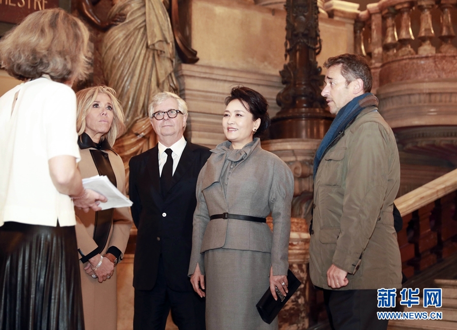 當(dāng)?shù)貢r間3月25日,國家主席習(xí)近平夫人彭麗媛在法國總統(tǒng)夫人布麗吉特陪同下參觀位于巴黎市第九區(qū)的法國巴黎歌劇院。 新華社記者 丁林 攝