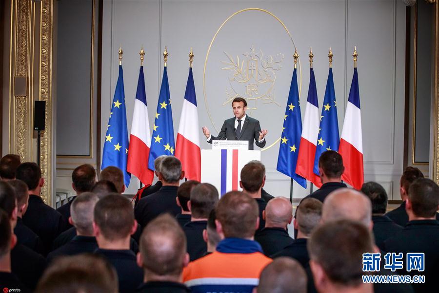 當?shù)貢r間2019年4月18日,法國巴黎,法國總統(tǒng)馬克龍在愛麗舍宮接見參與巴黎圣母院火災(zāi)救援任務(wù)的消防員。(圖片來源:東方IC)