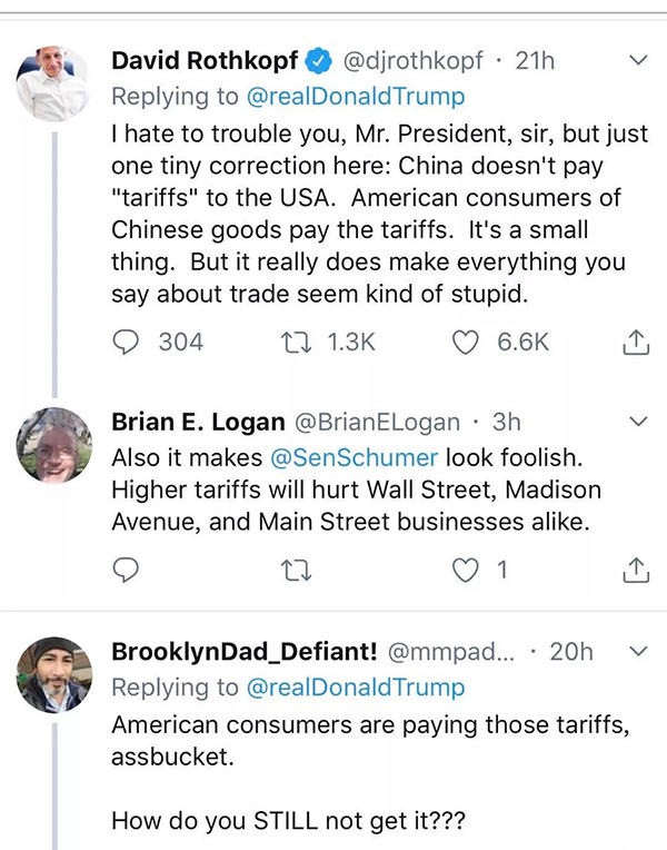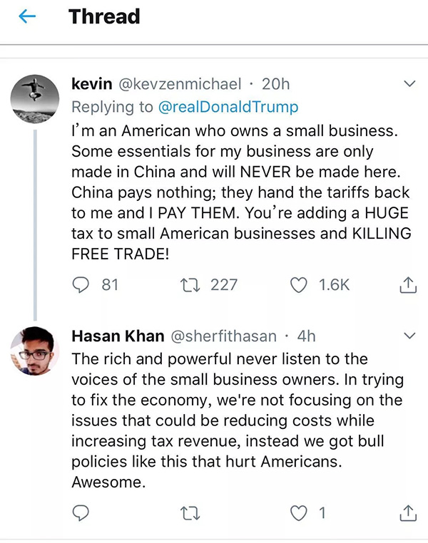 “我是一個(gè)擁有一家小企業(yè)的美國人。對(duì)我的生意來說,有些關(guān)鍵商品必須由中國制造而且永遠(yuǎn)也不可能在美國生產(chǎn)出來。中國什么也沒付,是我付出了那些關(guān)稅!你給美國的企業(yè)們加上了巨大的稅賦!你正在扼殺自由貿(mào)易!”