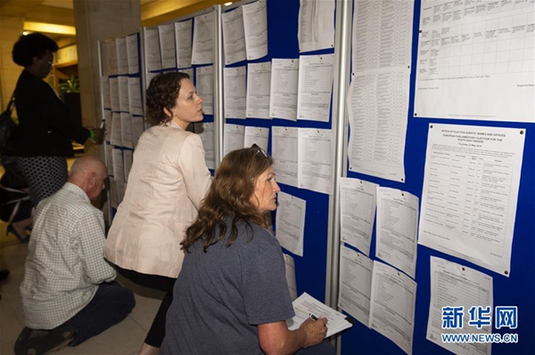 5月26日,在英國南安普敦的一個計票站,媒體和黨派成員查看投票結(jié)果。新華社發(fā)(雷伊·唐 攝)