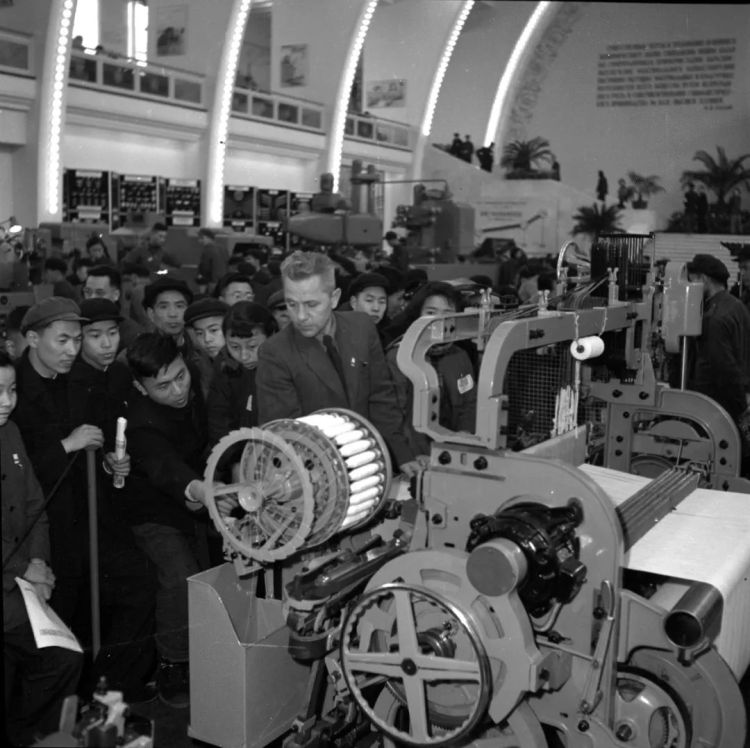 ↑上海,觀眾在蘇聯(lián)經(jīng)濟及文化建設(shè)成就展覽會上參觀蘇聯(lián)制造的自動織布機.(1955年3月15日,楊溥濤)